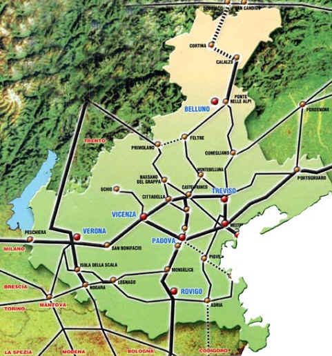 Mapa localizando a região do Vêneto, de onde vieram os Camozzato. Montebelluna está bem próximo de Treviso